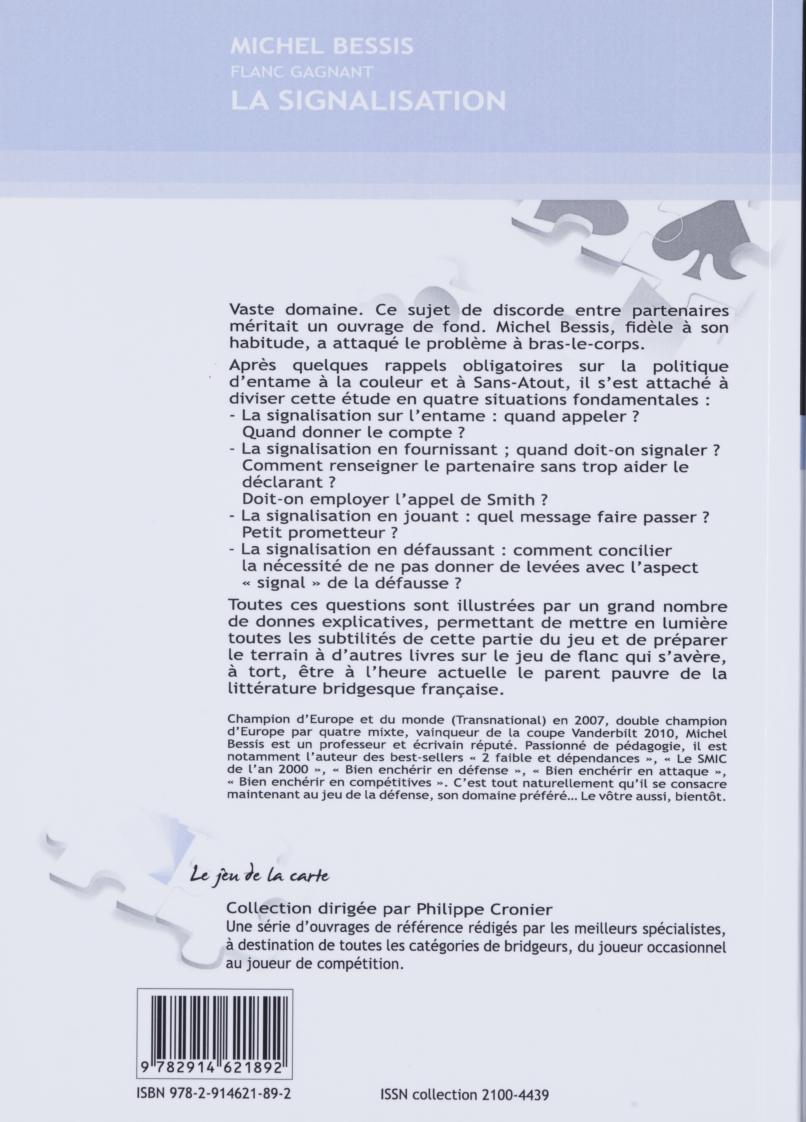Véritable bible en matière de signalisation, cet ouvrage a comblé un manque dans la littérature bridgesque. Après quelques rappels obligatoires sur la politique d'entame à la couleur et à Sans-Atout, Michel Bessis s'est attaché à diviser l'étude de ce vaste sujet en quatre situations fondamentales :