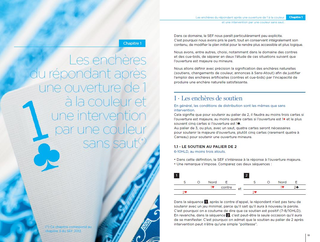 - D’une part, nombre de situations décrites, qui ont tout à fait logiquement leur place au sein d’un ouvrage qui présente un système cohérent, étaient jusqu’ici absentes du SEF. C’est le cas par exemple du Rubensohl, système de défense contre les interventions sur 1SA, ou des modifications des enchères si l’adversaire intervient sur un 2 faible. Les auteurs ont donc dû exercer des choix, en espérant obtenir l’aval de leurs lecteurs d’abord, des rédacteurs des versions à venir du SEF ensuite.