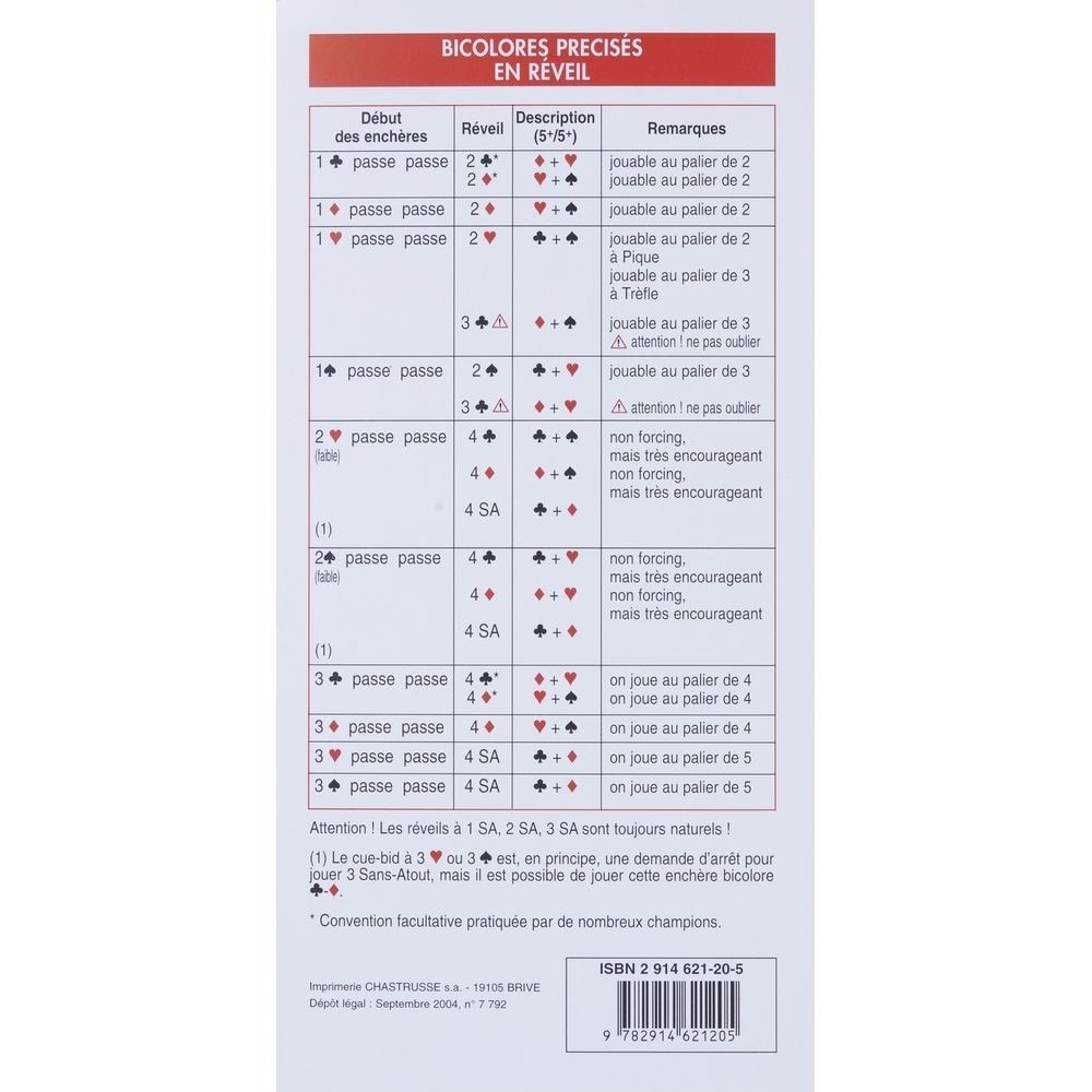 Plaquette de bridge permettant de décrire 10 cartes de son jeu sur ouverture adverse: tableaux récapitulatifs et exemples. Guillaumin Pierre-Yves